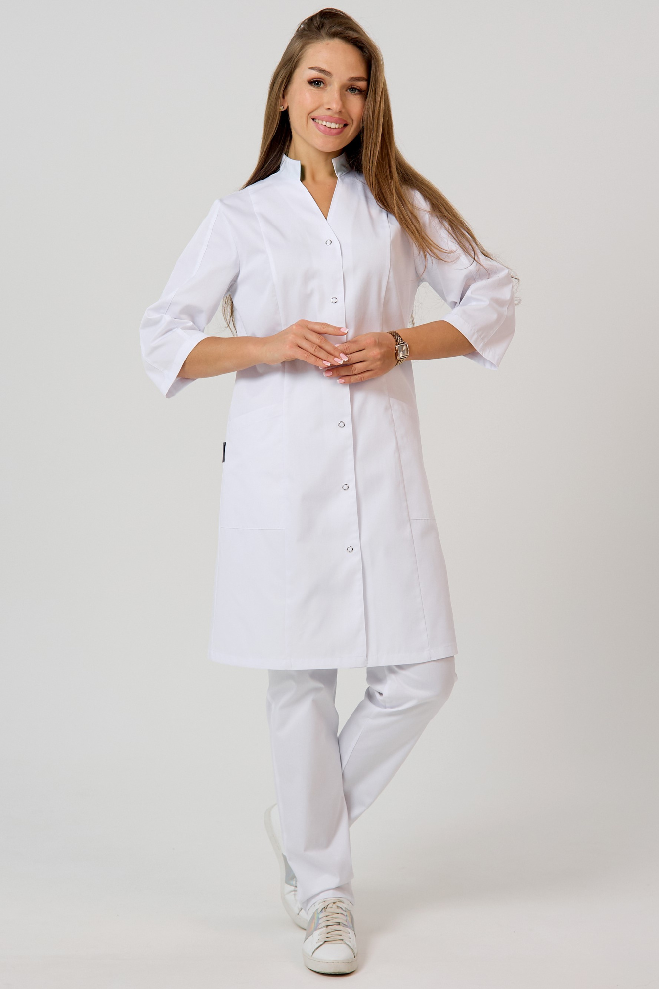 Халат женский из хлопкополиэфирных тканей, полуприлегающего силуэта, с воротником-стойкой, V-вырезом горловины, с центральной застежкой на шесть кнопок.