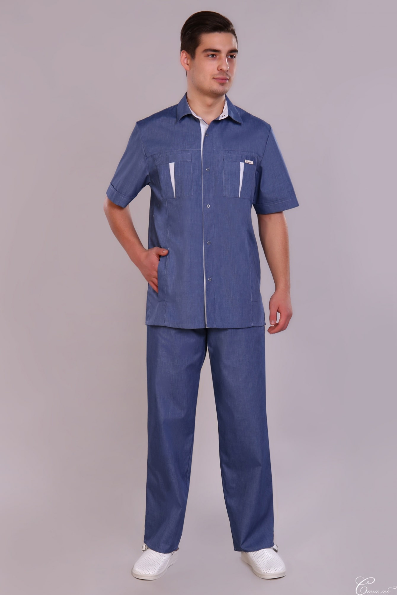 Костюм мужской медицинский из смесовых тканей состоит из куртки и брюк.