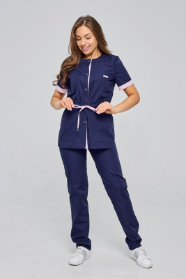 Костюм медицинский женский из смесовой ткани Тиси. Костюм состоит из куртки и брюк. Куртка полуприлегающего силуэта с полукруглым нижним срезом. По линии талии куртки настрочена кулиска, внутри которой вложен шнур для регулирования изделия по ширине. В боковых швах куртки вшиты треугольники из отделочной ткани.