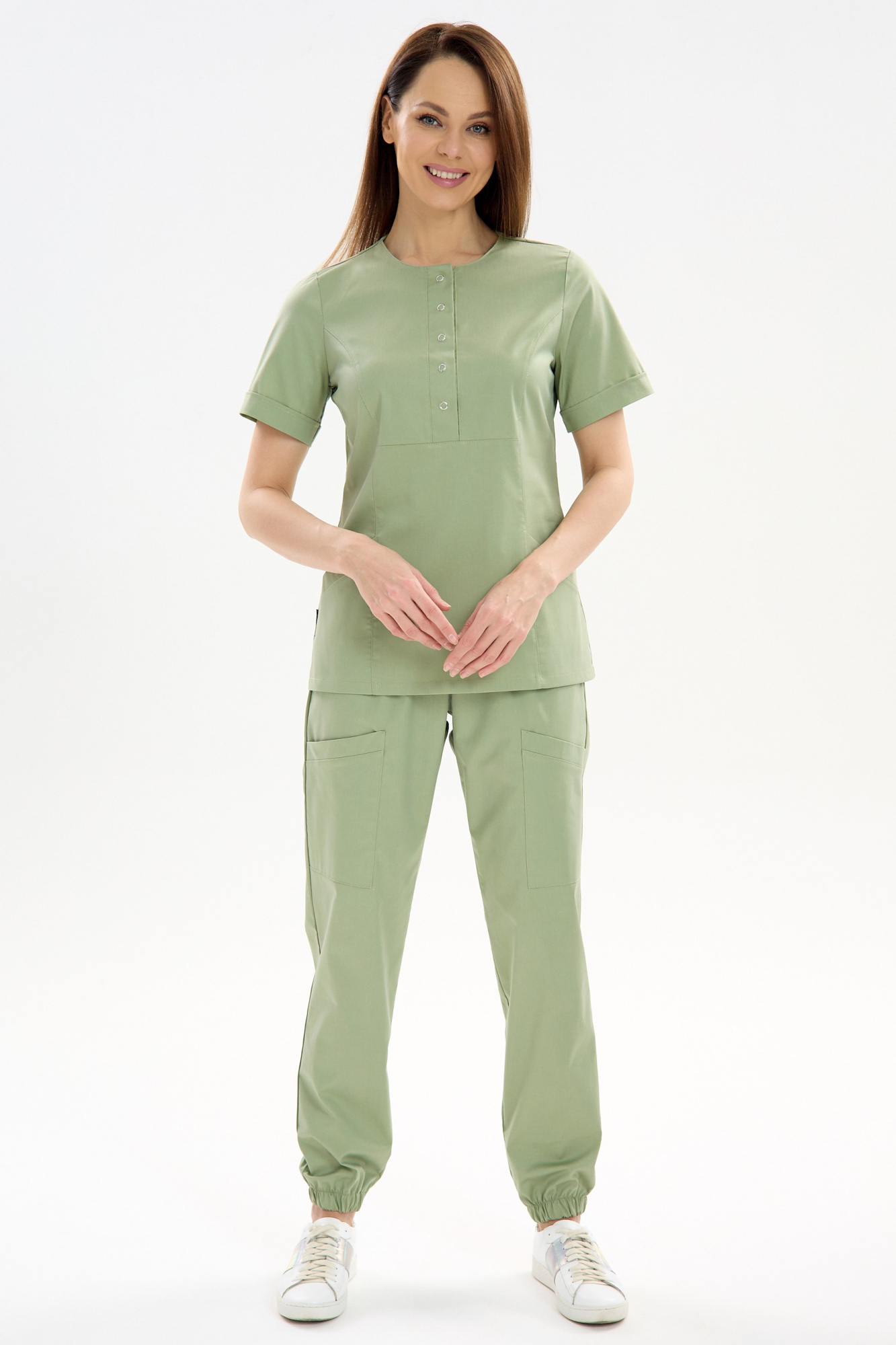 Костюм медицинский женский из смесовой ткани CVC. Костюм состоит из куртки и брюк.