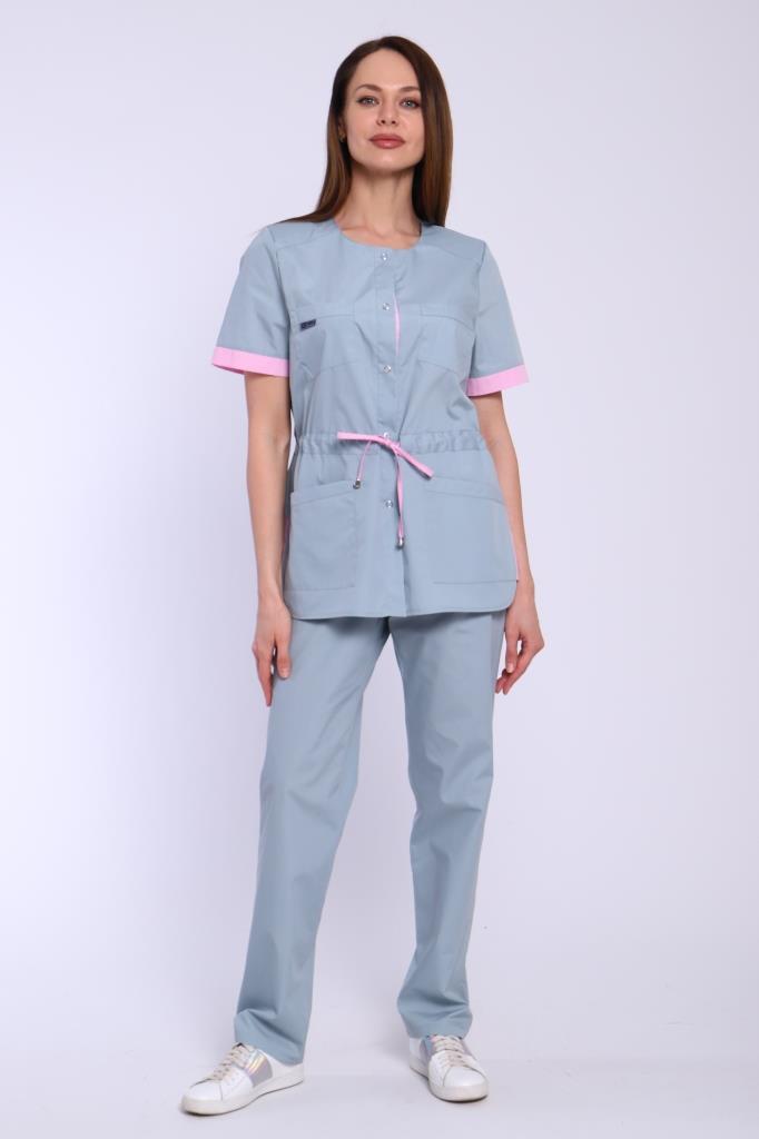 Костюм медицинский женский из смесовой ткани Тиси. Костюм состоит из куртки и брюк. Куртка полуприлегающего силуэта с полукруглым нижним срезом. По линии талии куртки настрочена кулиска, внутри которой вложен шнур для регулирования изделия по ширине. В боковых швах куртки вшиты треугольники из отделочной ткани.