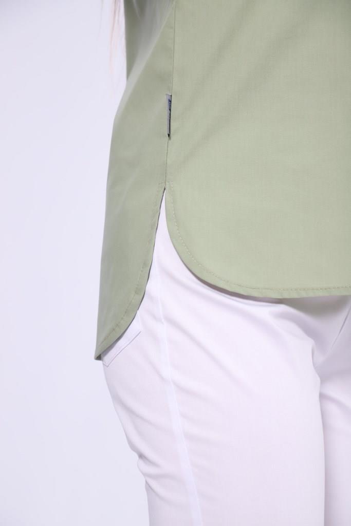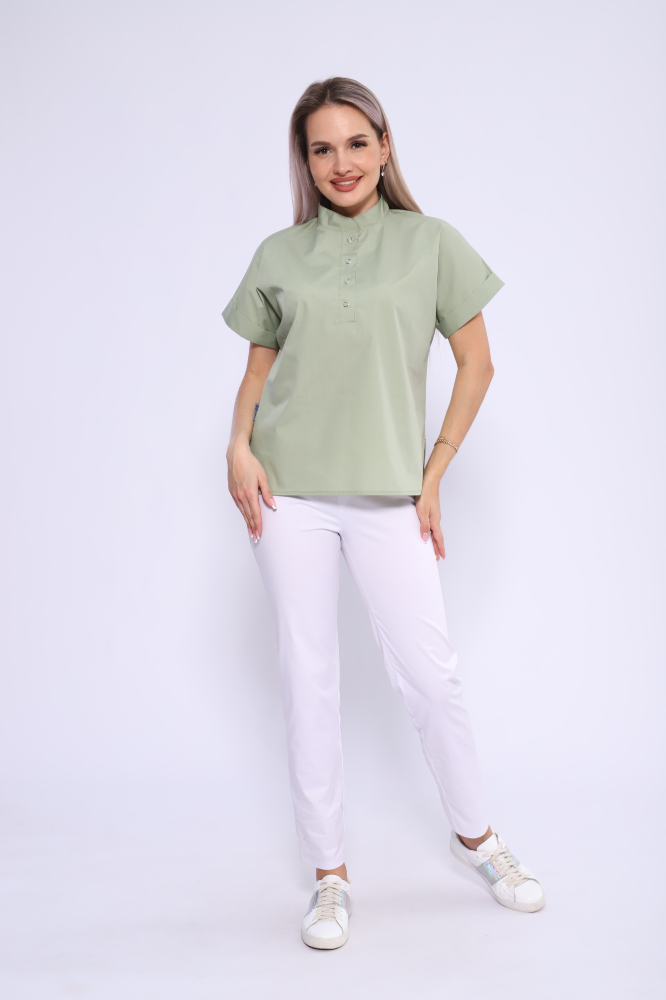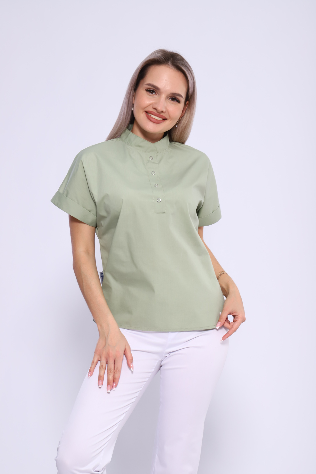 На полочках обработана застежка «поло», застегивающаяся на 4 рубашечных кнопки.
